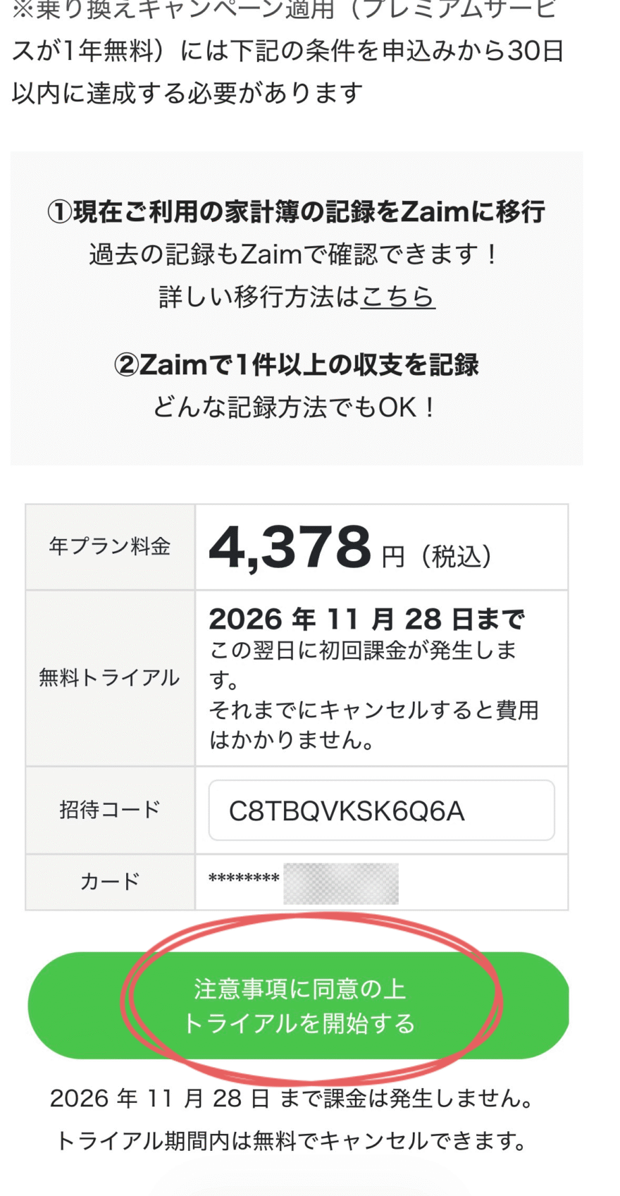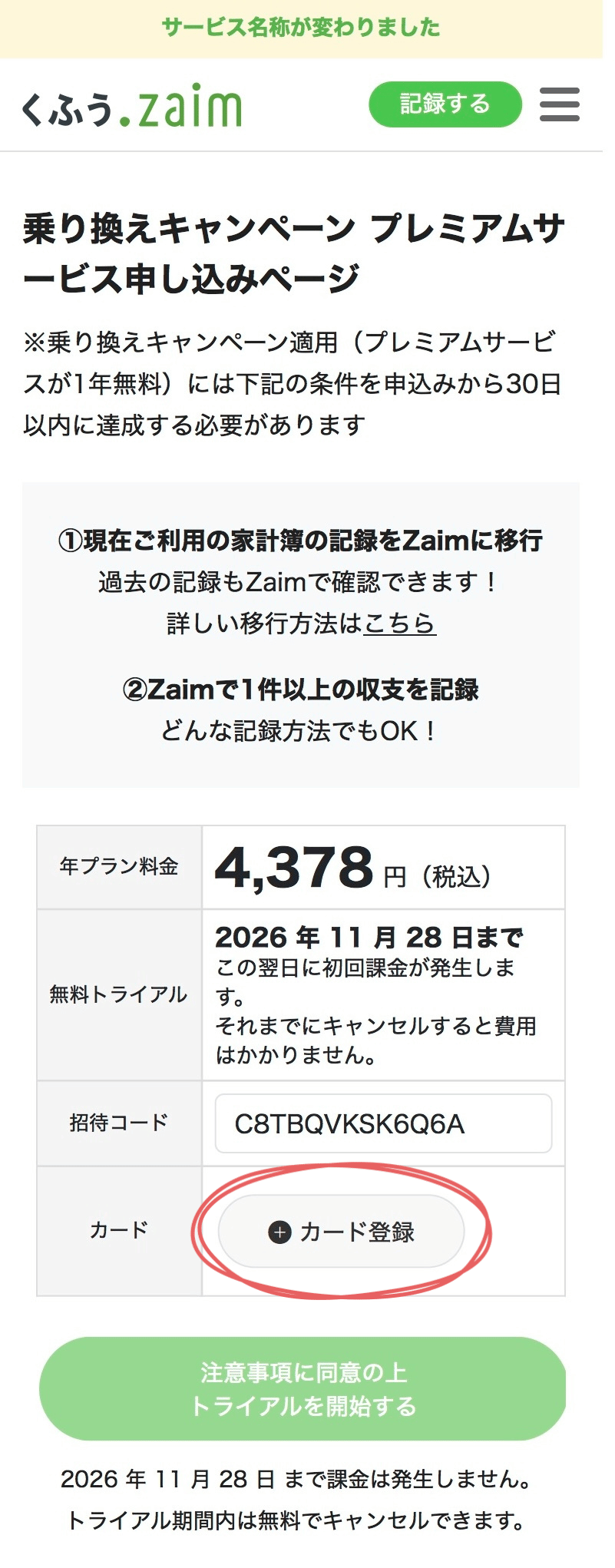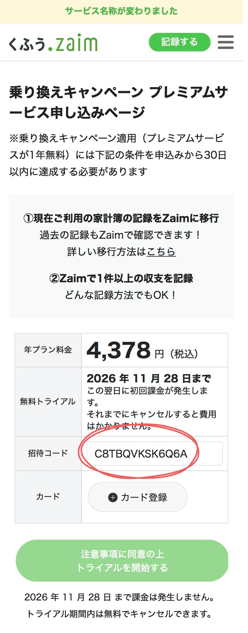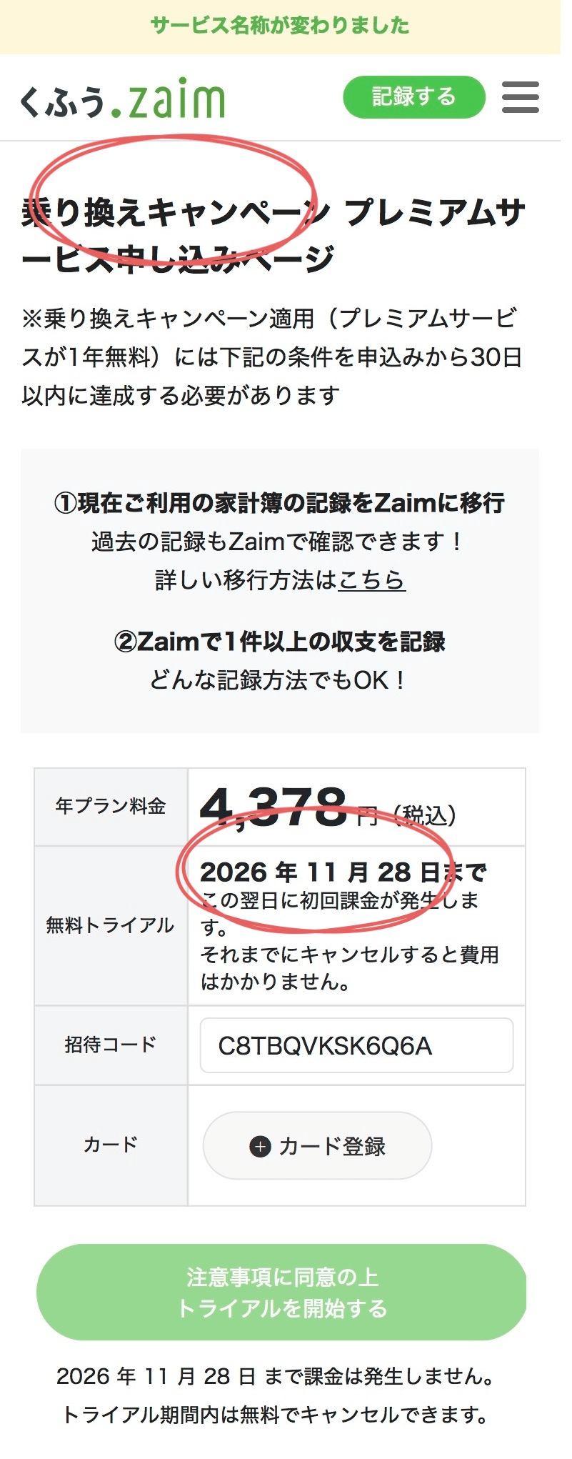 申込ページのタイトルに乗り換えキャンペーンと記載があって、無料トライアル期間が1年後に設定されていれば、キャンペーン専用ページで申し込めています。